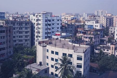 The rooftops of the buildings with a hazy smog of the skyline of suburb of Kandivali in the city of Mumbai.