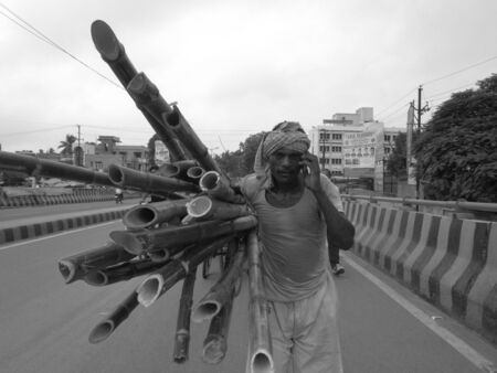 LABOURER TALKING ON MOBILE WHILE CARRYING BUMBOOS. SHOT AT PATNA, BIHAR, INDIA 09.11.12 , 0643AM