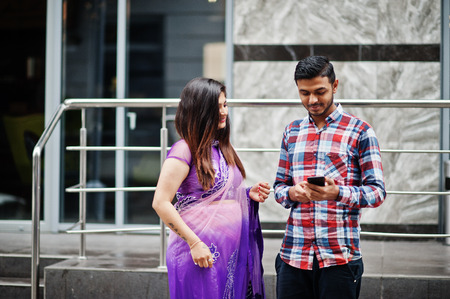 Stylish indian hindu couple posed on street and looking at mobile phone.
