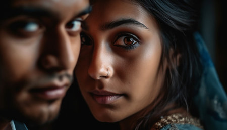 Indian couple man and woman sitting on home sofa, boy gently touching girls face while both look into each others eyes with love. Young family sharing emotional intimate moment full of tenderness