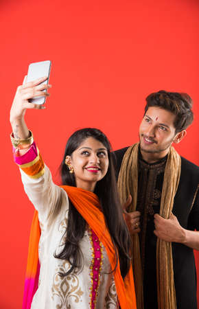 Indian couple in traditional dress taking selfies after celebrating Karva Chauth festival at home - Concept of using Mobile, technology during festival celebrations.