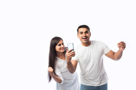 Indian couple man and woman sitting on home sofa, celebrating lottery win on smartphone with emotions of surprise and joy. Young family looks excited and happy while reacting to jackpot result indoors