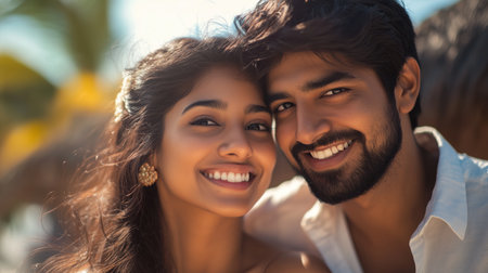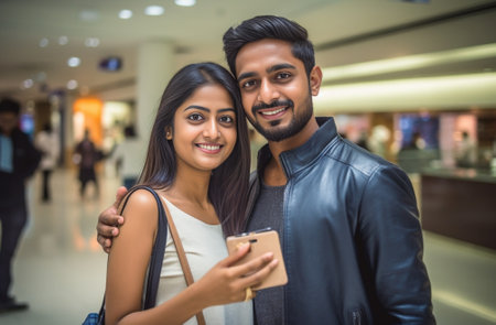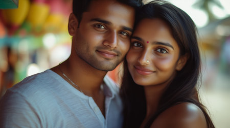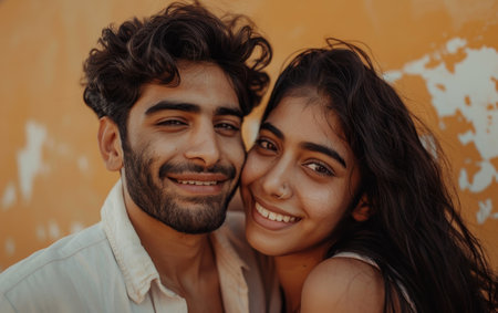 A shallow focus of an Indian male and female taking a selfie with smiling faces