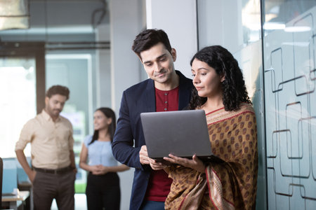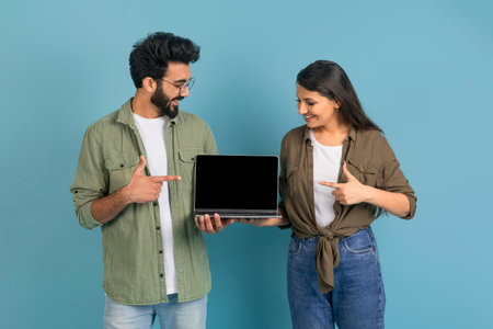 Indian couple using laptop and smiling while sitting on sofa in living room at home