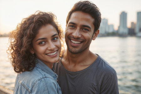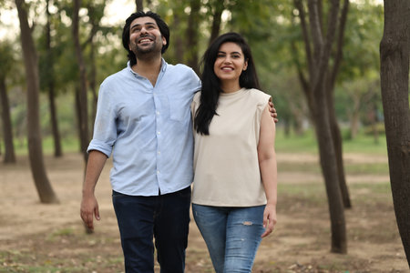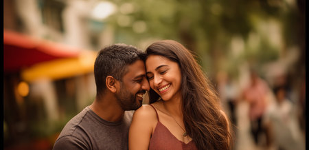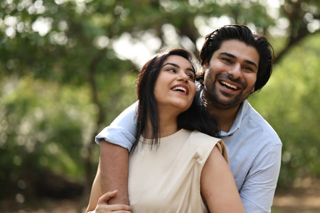 Nagpur, Maharahstra, India - March 2019: Candid portrait of a young, romantic couple having fun beside a lake.
