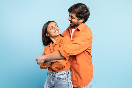 Lovely indian woman hugging her husband from behind, smiling and feeling happy on yellow studio background