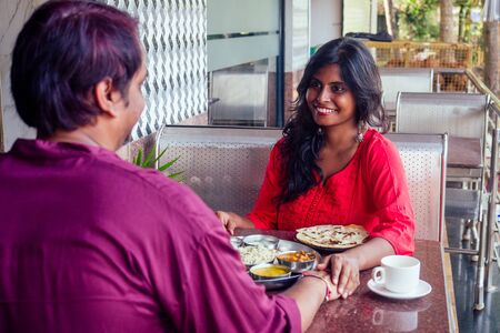 romance couple meeting at cafe and eating thali and drinking masala chai. valentines day dating concept