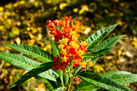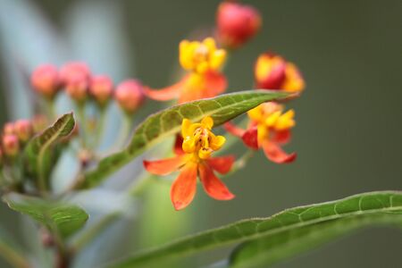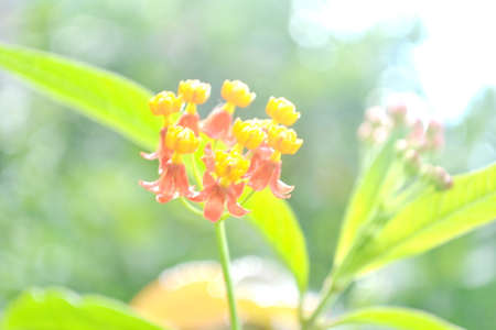 Closeup Tropical milkweed flower in yellow red pink (Asclepias curassavica)