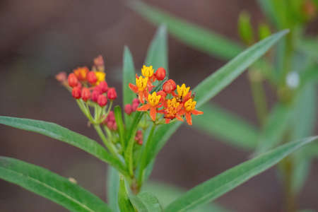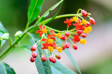 Asclepias curassavica is plant in the family Apocynaceae is herbaceous plant. Green leaves Red-orange flower bouquet of flowers, petiole bouquet.