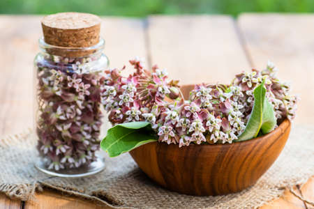 Virginia silkweed Collected flowers in transparent bottle with a cortical cork. And fresh inflorescences butterfly flower, silkweed, silky swallow-wort, Asclepias in wooden dish on table