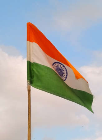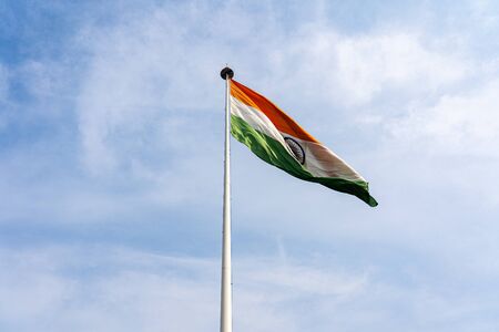 Flag of India waving in the wind against the blue sky with clouds