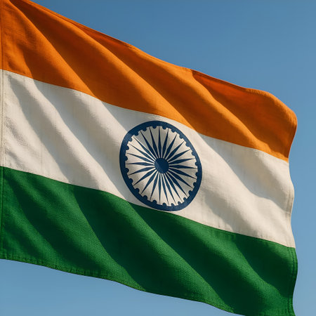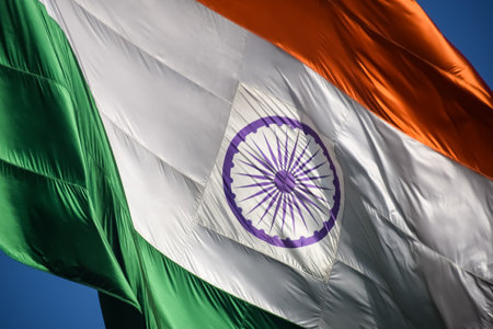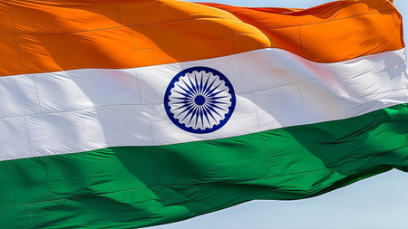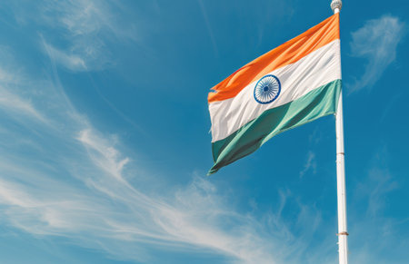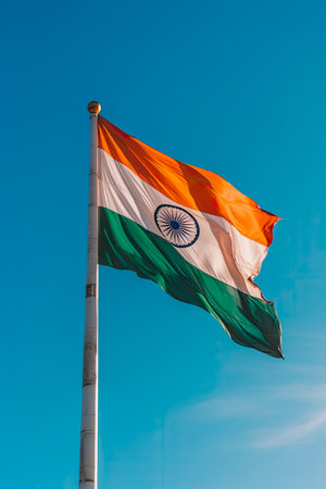 The majestic national flag of India flutters against a clear blue sky, symbolizing pride and patriotism. Indian Independence Day