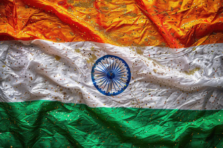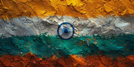 An artistic rendition of the Indian flag featuring vibrant splashes of orange, white, and green, evoking a sense of patriotism and creativity. The central Ashoka Chakra stands out against the textured background.