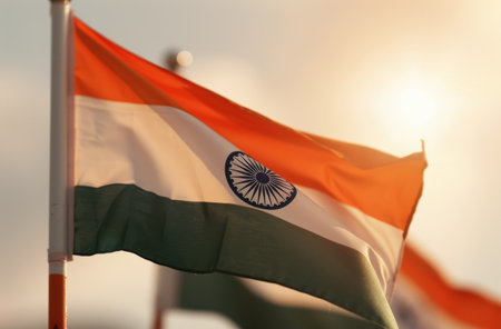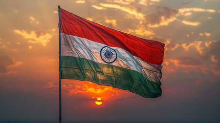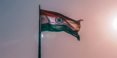 An Indian flag is depicted waving proudly, with vibrant orange, white, and green stripes. The sun's light bathes the flag in a warm glow, with rays creating a bright backdrop. This image could be suitable for editorial content, national day celebrations, or representing India.