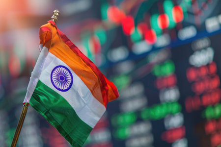 Indian flag waving with stock market graphs in background