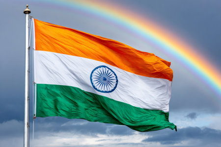 Indian national flag, tiranga, waving proudly with the ashoka chakra against a dramatic sky and rainbow