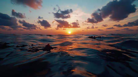 A breathtaking view from the surface of the ocean as the sun sets on the horizon, casting a golden glow on the water and illuminating the dramatic clouds in the sky.