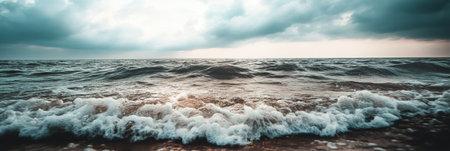 Majestic ocean waves crash softly against the shore, framed by a brooding sky of clouds, evoking a sense of tranquility and the raw beauty of nature's coastal landscapes.