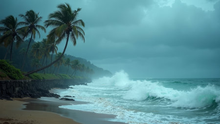 Tropical beach storm with palm trees and crashing waves under moody skies.