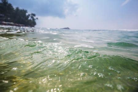 View from a tropical sandy beach on sea turquoise with clear water in clear weather. Paradise view of the ocean with waves and blue sky. South Goa, India. The concept of an exotic vacation, travel, lifestyle, adventure.