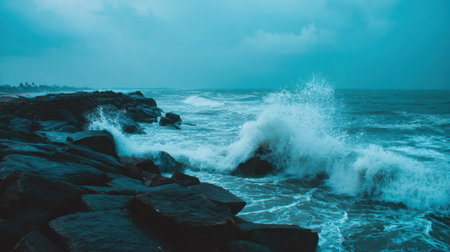 A breathtaking scene depicting turbulent ocean waves crashing against a rugged shoreline. The moody blue tones and overcast sky evoke a sense of nature's raw beauty and power.