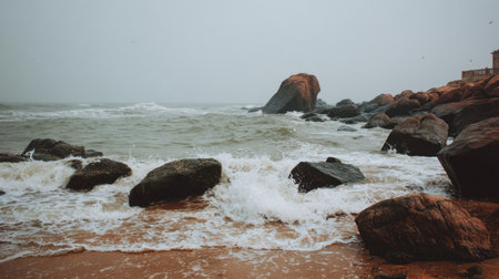 A calm coastal landscape showcasing a rocky shoreline with gentle waves lapping at the sand, enveloped in an overcast atmosphere offering a tranquil escape.