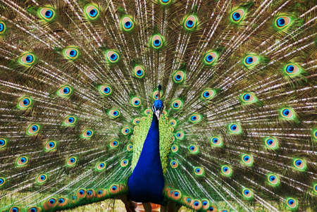Peacock showing his lush tail full of feathers in a ZOO in Cali, Colombia