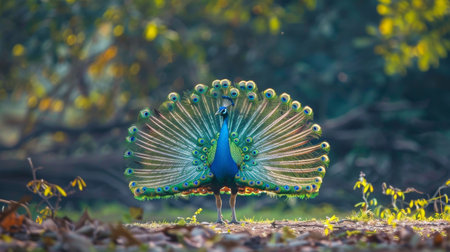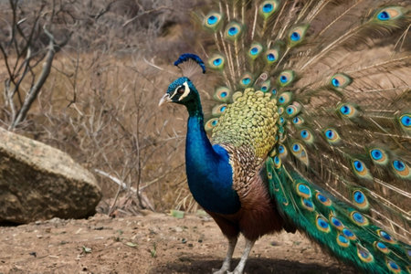 Striking peacock displaying colorful plumage in natural outdoor environment