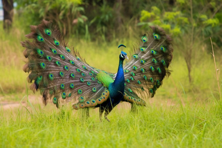 A majestic Indian Peafowl stands in the grass with its vibrant feathers open in a display. The peacocks beautiful plumage is showcased as it stands gracefully in its natural habitat.