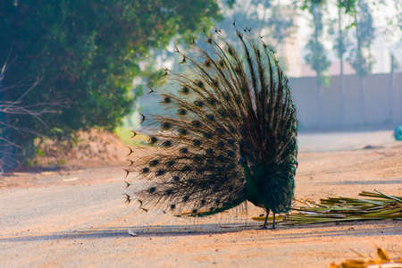 Beautiful peacock in the park at sunset. Wildlife scene from nature.