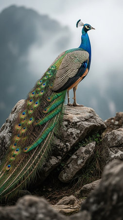 Majestic Peacock Standing on Rocky Mountain Cliff at Sunrise – Vibrant Feathers and Natural Wildlife Scene