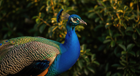 A majestic peacock showcases its stunning plumage, featuring intricate patterns and vivid colors, set against a backdrop of dense foliage.