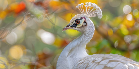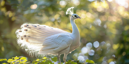 AI Generated. Regal white peacock with golden accents in a coastal luxury setting