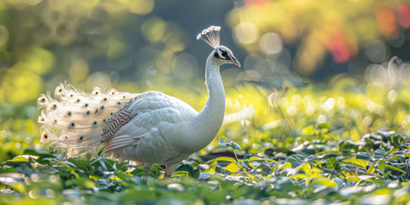 A majestic white peacock in a field of wildflowers, its feathers spread wide and glowing in the bright sunlight
