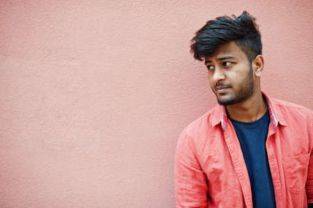 Portrait of young stylish indian man model isolated on pink wall background.