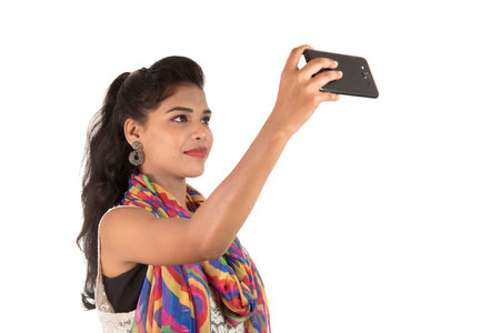 Young Indian traditional girl using a mobile phone or smartphone isolated on a white background