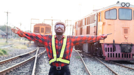 African engineer raised a hand to control a the train on railway with talking by radio communication or walkie talkie
