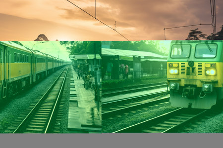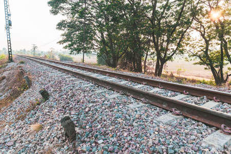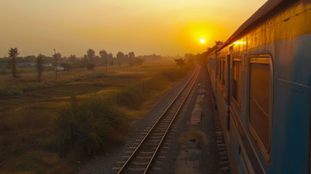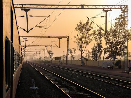A train running towards horizon where sun is rising, orange sky of a new dawn in the background. Indian railway stock Image,