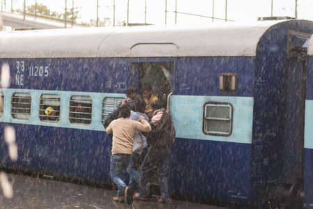 Haridwar, India - March 11, 2017: Crowd boarding train in Haridwar railway station under heavy monsoon rain. Young boys fighting to get on the coach.