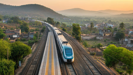 A modern train speeds towards a rural station at sunset, showcasing beautiful landscapes, serene hills, and a peaceful village environment. Perfect for travel themes.