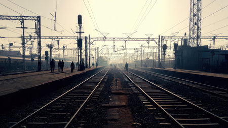 Early morning light illuminates train tracks and silhouettes of people waiting on the platform. The atmosphere is calm as trains stand still in the background