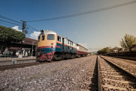 Low angle photo Front of old train led with Diesel Electric locomotives on the tracks of Thailand.