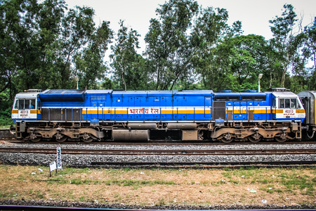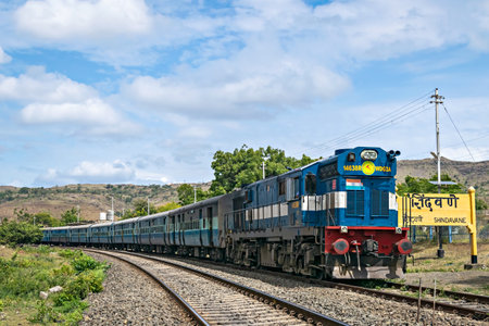 Khandala, Maharashtra, India- September 5th, 2015 : Indian Railway's passenger train, passing through steep gradient in ghat section with beautiful blue sky background.