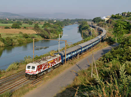 Amul Milk advertised locomotive with Indore express running parallel to a river in through Kamshet, pune, India.