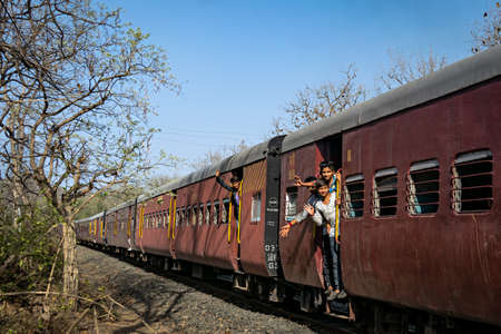 Sasan Gir, Gujrat India - April 17th, 2018: Children joyfully waving from the door of a slow moving passenger train.