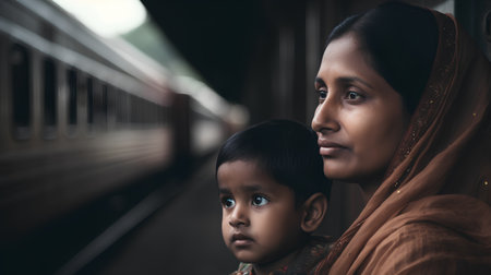 Portrait of indian mother with her son at train station.