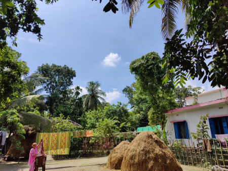 A nepali woman in a colorful saree is hangig up her laundry in the countryside of the terai, the most southern, warm, flat and fertile part of Nepal unrecognizable person