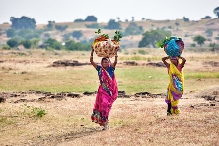 Rajasthan, India– February 3, 2011: Three Rajasthani women carry heavy loads. Rajasthani people are renown as the most colorful people in India.