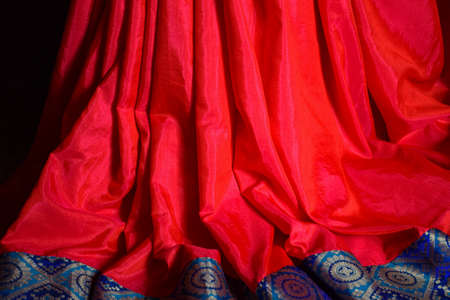 Stock photo of beautiful red color silk saree with blue and golden color border, Picture captured under natural light at Bangalore, Karnataka, India. focus on object.