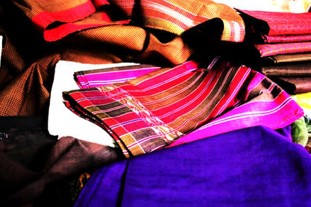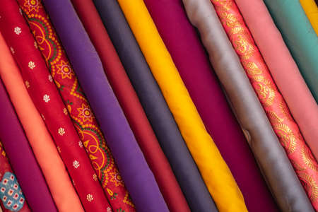 variegated multi colored fabrics in the Indian traditions at the exhibition